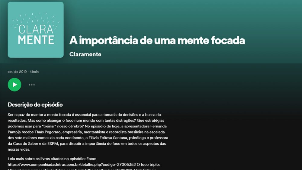 Descrição do episódio Ser capaz de manter a mente focada é essencial para a tomada de decisões e a busca de resultados. Mas como alcançar o foco num mundo com tantas distrações? Que estratégias podemos usar para “treinar” nosso cérebro? No episódio de hoje, a apresentadora Fernanda Pantoja recebe Thaís Pegoraro, empresária, montanhista e recordista…